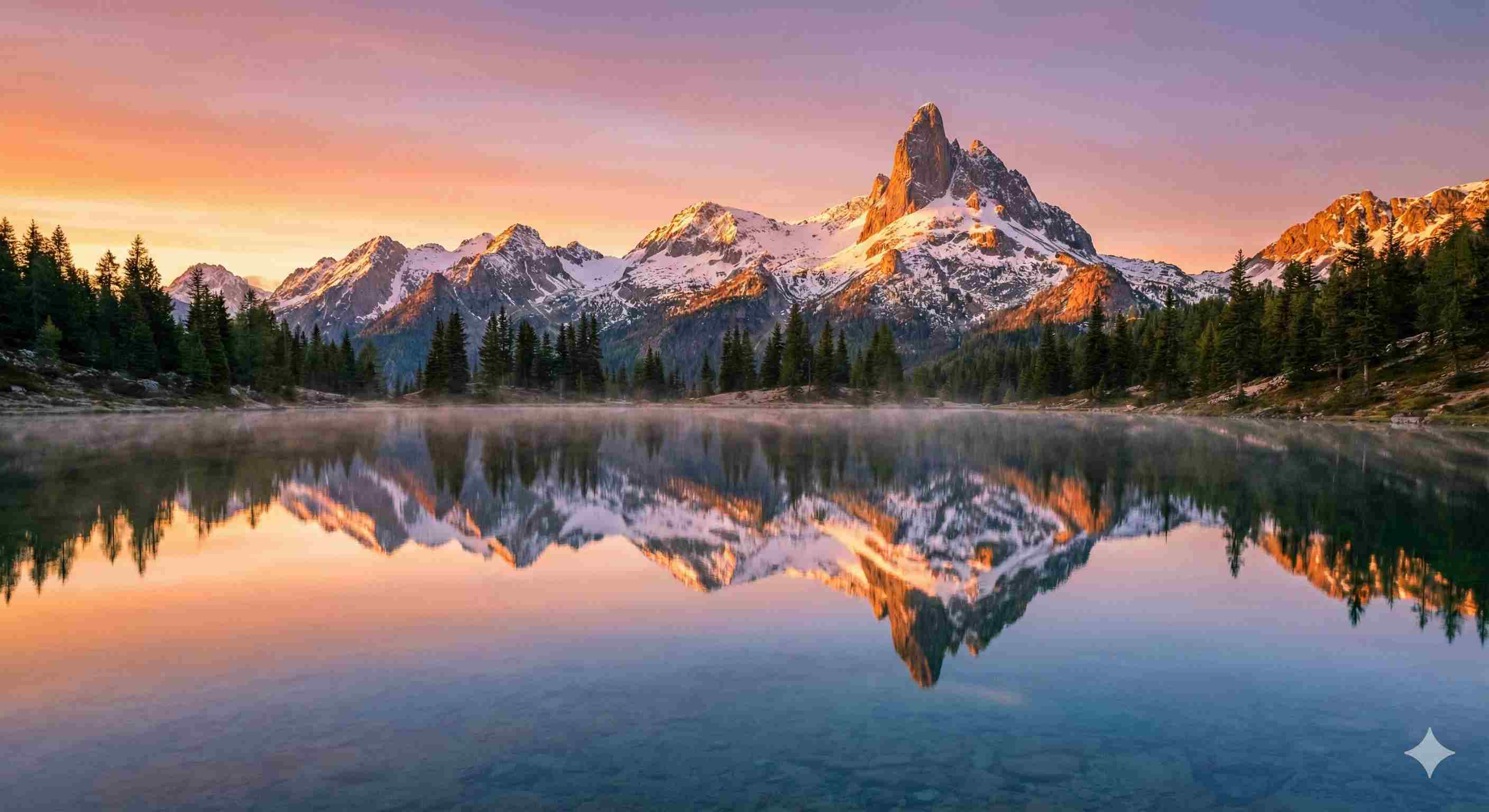 "Snow-capped mountain peaks reflecting in pristine alpine lake during golden hour"